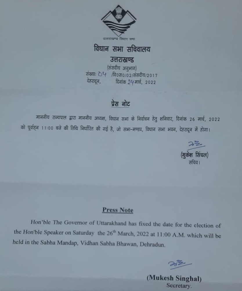 सचिव मुकेश सिंघल के आदेश के मुताबिक, उत्तराखंड के राज्यपाल लेफ्टिनेंट जनरल गुरमीत सिंह (सेवानिवृत्त) ने विधानसभा अध्यक्ष के चुनाव की तिथि शनिवार 26 मार्च को सुबह 11 बजे विधानसभा देहरादून में निर्धारित की है।
