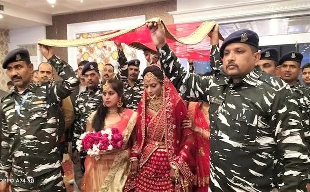 These men walking with the bride are central reserve police force officers. The bride is the sister of late Shailendra Pratap Singh who was martyred in 2020. The marriage ceremony was solemnised in Rae Bareli, Uttar Pradesh