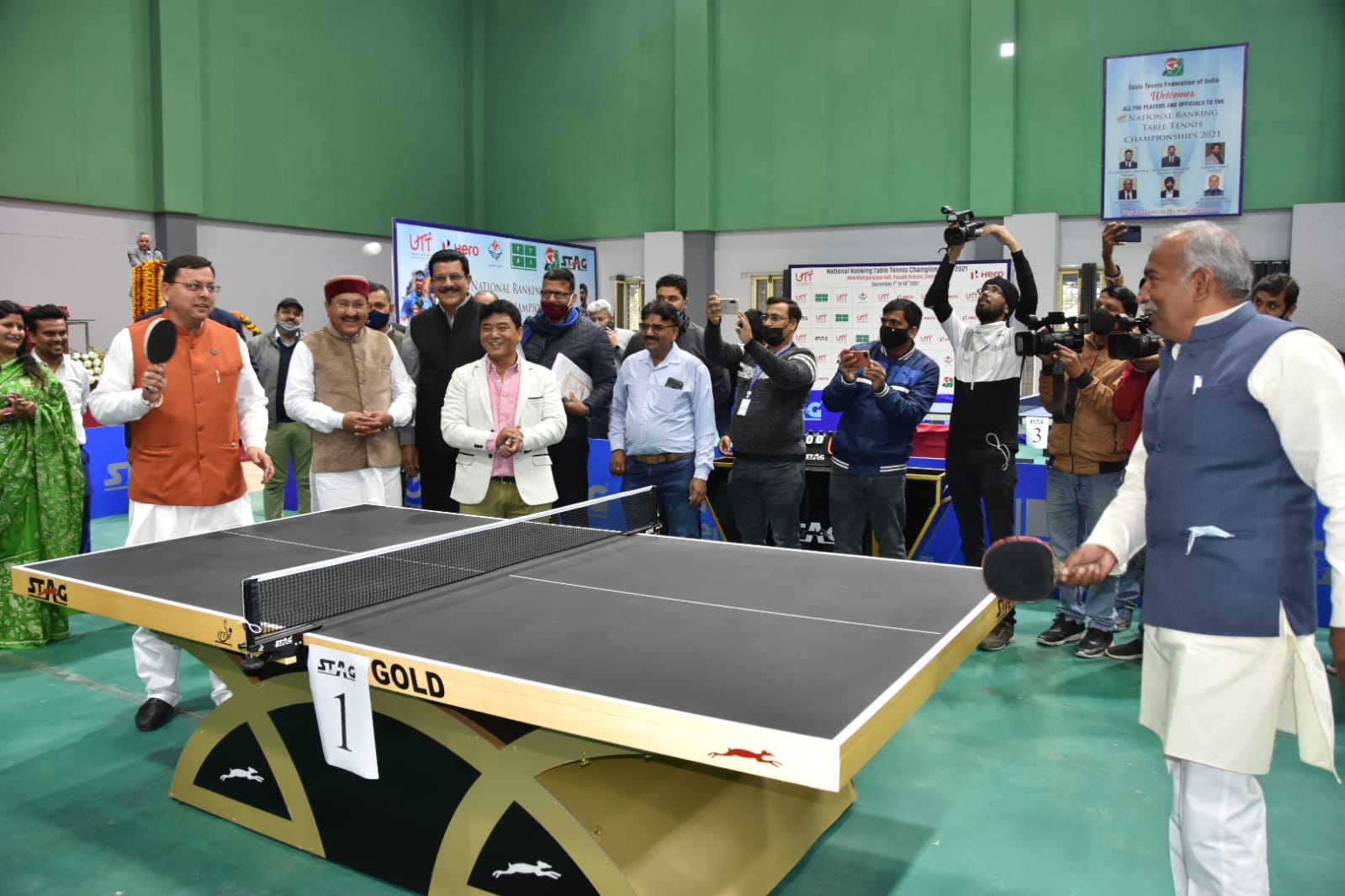 देहरादून : मुख्यमंत्री पुष्कर सिंह धामी ने मंगलवार को परेड ग्राउण्ड, देहरादून स्थित बहुद्देशीय खेल सभागार में राष्ट्रीय रैंकिंग टेबल टेनिस प्रतियोगिता का शुभारम्भ किया। सीएम धामी और खेल मंत्री अरविंद पांडे ने टेनिस खेला। दोनों के बीच टक्कर को देख अधिकारियों औऱ कर्मचारियों समेत खिलाड़ियों ने मैच का लुत्फ उठाया। आपको बता दें कि इसके बाद टेनिस प्रतियोगिता का शुभारंभ हुआ। यह प्रतियोगित 07 से 14 दिसम्बर 2021 तक चलेगी।
