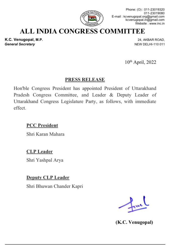 उत्तराखंड कांग्रेस से बड़ी खबर, मिल गया नया प्रदेश अध्यक्ष और नेता प्रतिपक्ष