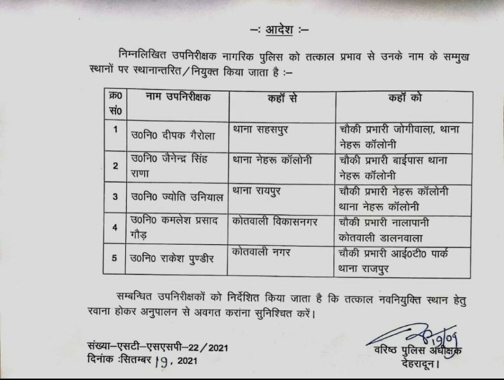 देहरादून एसएसपी ने सहसपुर थाने में तैनात दीपक गैरोला को जोगीवाला चौकी प्रभारी बनाया है तो वहीं जैनेंद्र सिंह को थाना नेहरु कॉलोनी से बाईपास थाना, नेहरू कॉलोनी, का चौकी प्रभारी बनाया गया है। तो वहीं इसी के साथ रायपुर थाने में तैनात उप निरीक्षक ज्योति गैरोला को नेहरु कॉलोनी चौकी प्रभारी बनाया गया है। विकासनगर कोतवाली में तैनात कमलेश प्रसाद को नालापानी, कोतवाली, डालनवाला का चौकी प्रभारी बनाया गया है। इसी के साथ कोतवाली नगर में तैनात राकेश पुंडीर को आईटी पार्क चौकी प्रभारी बनाया गया है।