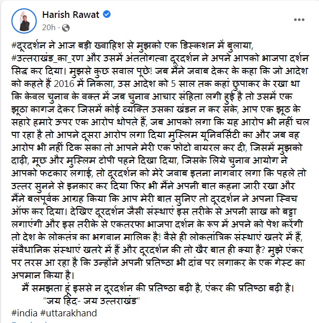 हरीश रावत ने लिखा कि दूरदर्शन ने आज बड़ी ख्वाहिश से मुझको एक डिस्कशन में बुलाया, उत्तराखंड का रण और उसमें अंततोगत्वा दूरदर्शन ने अपने आपको भाजपा दर्शन सिद्ध कर दिया। मुझसे कुछ सवाल पूछे! जब मैंने जवाब देकर के कहा कि जो आदेश को कहते हैं 2016 में निकला, उस आदेश को 5 साल तक कहां छुपाकर के रखा था कि केवल चुनाव के वक्त में जब चुनाव आचार संहिता लगी हुई है तो उसमें एक झूठा कागज देकर जिसमें कोई व्यक्ति उसका खंडन न कर सके, आप एक झूठ के सहारे हमारे ऊपर एक आरोप थोपते हैं, जब आपको लगा कि यह आरोप भी नहीं चल पा रहा है तो आपने दूसरा आरोप लगा दिया मुस्लिम यूनिवर्सिटी का और जब वह आरोप भी नहीं टिक सका तो आपने मेरी एक फोटो वायरल कर दी, जिसमें मुझको दाढ़ी, मूछ और मुस्लिम टोपी पहने दिखा दिया, जिसके लिये चुनाव आयोग ने आपको फटकार लगाई, तो दूरदर्शन को मेरे जवाब इतना नागवार लगा कि पहले तो उत्तर सुनने से इनकार कर दिया फिर भी मैंने अपनी बात कहना जारी रखा और मैंने बलपूर्वक आग्रह किया कि आप मेरी बात सुनिए तो दूरदर्शन ने अपना स्विच ऑफ कर दिया।
