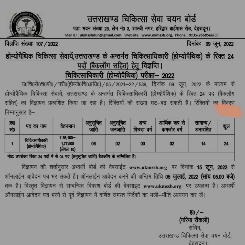 विज्ञप्ति के अनुसार होम्योपैथिक चिकित्सा सेवायें, उत्तराखण्ड के अन्तर्गत चिकित्साधिकारी (होम्योपैथिक) के रिक्त 24 चिकित्साधिकारी (होम्योपैथिक) परीक्षा- 2022उ०चि० से०च०बो० / परी० (होम्यो०चि०अधि०)/05/2021-22/539, दिनांक 09 जून, 2022 के माध्यम से होम्योपैथिक चिकित्सा सेवायें, उत्तराखण्ड के अन्तर्गत चिकित्साधिकारी (होम्योपैथिक) के रिक्त 24 पद (बैकलॉग सहित) का विज्ञापन प्रकाशित किया जा रहा है। रिक्तियों की संख्या घट-बढ़ सकती है। विज्ञापन की शर्तानुसार अभ्यर्थी बोर्ड की वेबसाईट www.ukmssb.org पर दिनांक 15 जून, 2022 से ऑनलाईन आवेदन पत्र भर सकते हैं। ऑनलाईन आवेदन करने की अन्तिम तिथि 05 जुलाई, 2022 (सांय 05.00 बजे) तक है। विस्तृत विज्ञापन से सम्बन्धित विवरण बोर्ड की वेबसाइट www.ukmssb.org पर उपलब्ध है। अभ्यर्थी ऑनलाईन आवेदन पत्र भरने से पूर्व विज्ञापन में वर्णित समस्त निर्देशों का भली-भाँति अध्ययन कर लें।