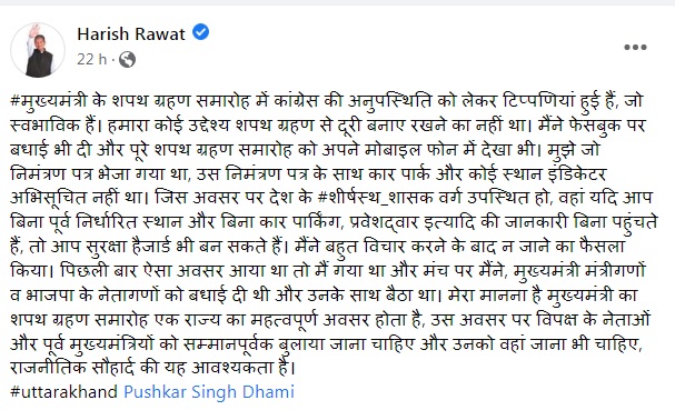 हरीश रावत ने लिखा कि मुख्यमंत्री के शपथ ग्रहण समारोह में कांग्रेस की अनुपस्थिति को लेकर टिप्पणियां हुई हैं, जो स्वभाविक हैं। हमारा कोई उद्देश्य शपथ ग्रहण से दूरी बनाए रखने का नहीं था। मैंने फेसबुक पर बधाई भी दी और पूरे शपथ ग्रहण समारोह को अपने मोबाइल फोन में देखा भी। मुझे जो निमंत्रण पत्र भेजा गया था, उस निमंत्रण पत्र के साथ कार पार्क और कोई स्थान इंडिकेटर अभिसूचित नहीं था। जिस अवसर पर देश के #शीर्षस्थ_शासक वर्ग उपस्थित हो, वहां यदि आप बिना पूर्व निर्धारित स्थान और बिना कार पार्किंग, प्रवेशद्वार इत्यादि की जानकारी बिना पहुंचते हैं, तो आप सुरक्षा हैजार्ड भी बन सकते हैं। मैंने बहुत विचार करने के बाद न जाने का फैसला किया। पिछली बार ऐसा अवसर आया था तो मैं गया था और मंच पर मैंने, मुख्यमंत्री मंत्रीगणों व भाजपा के नेतागणों को बधाई दी थी और उनके साथ बैठा था। मेरा मानना है मुख्यमंत्री का शपथ ग्रहण समारोह एक राज्य का महत्वपूर्ण अवसर होता है, उस अवसर पर विपक्ष के नेताओं और पूर्व मुख्यमंत्रियों को सम्मानपूर्वक बुलाया जाना चाहिए और उनको वहां जाना भी चाहिए, राजनीतिक सौहार्द की यह आवश्यकता है।